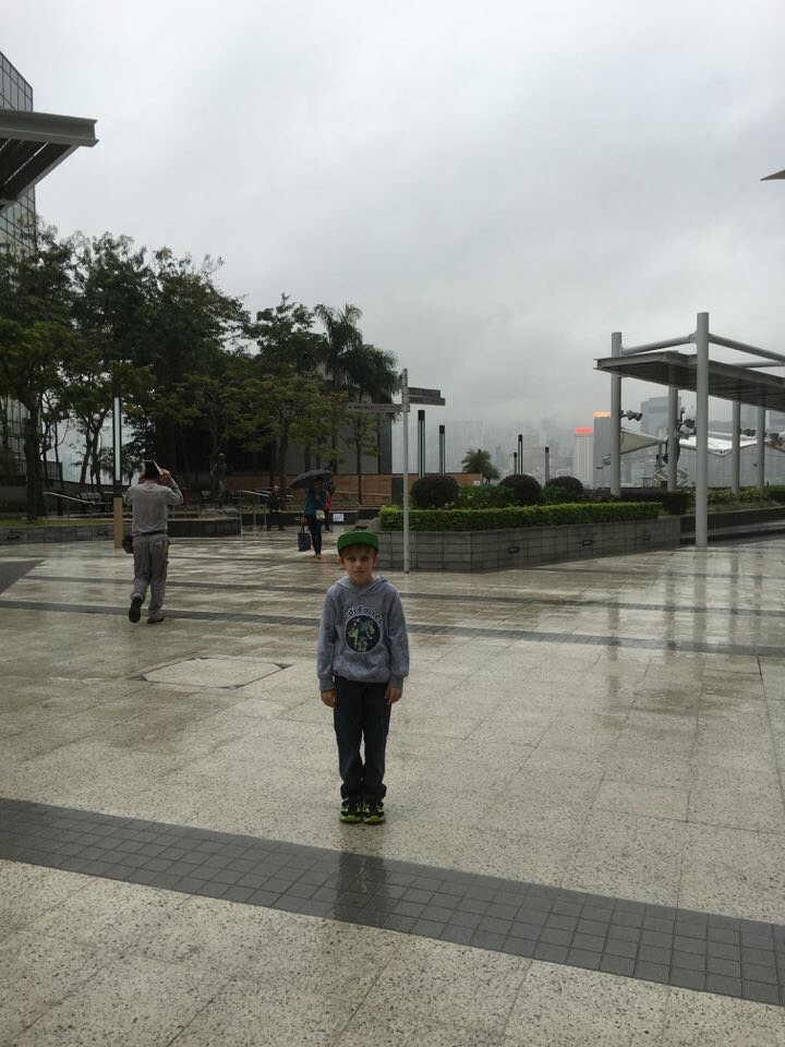 We then wandered around window shopping, down to the harbour front, and towards a couple of tourist attractions we had researched online. However the worsening weather beat us. Below is Sam in the Garden of the Stars, which everyone else viewed from the small shelter near the escalator seeing as the weather wasn’t conducive to exploring the garden.