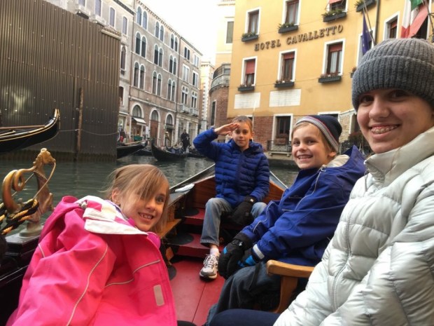 After lunch, we met Peter again at 2.45pm to go on a gondola ride. It was possibly a half hour journey but one we all agreed was just priceless and such a good experience. The gondolas only take a maximum of six passengers, so Jarrod and Tim joined another family from our tour for their ride. The tour group went in eight boats, and every fourth boat had an accordion player and opera singer on board to serenade us all. Sam now wants to be a musician on the gondolas, and Zac and Belle want to be gondoliers! Our gondolier was lovely, not rude at all, and gave us some history and information and answered any question presented to him.