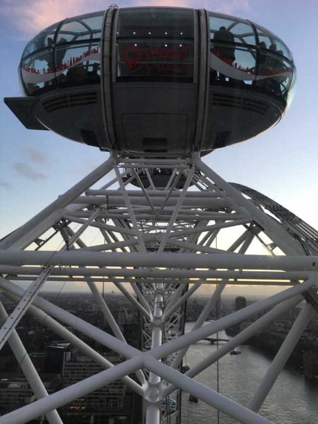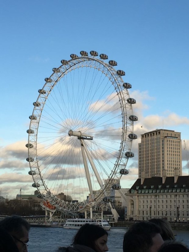 We then queued up to get on the Eye, and the man checking our tickets told us we had mistakenly joined the Fast Track line and needed to join the back of the “normal” queue, which snaked around and around and stretched across the road. Ross estimated we would wait about 2-3 hours in that line. The crowd propelled us forward towards another girl checking tickets. I looked forlornly at her and asked her to please not send a group our size to the back of the slow line. So…she didn’t. Three hours saved! Fifteen minutes later we were enjoying our ride on the London Eye, just as the sun was setting.
