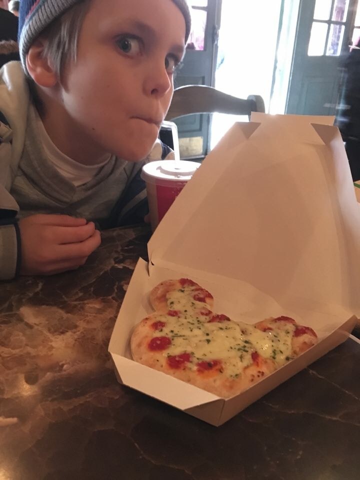 We just kept going all day, stopping only for a quick lunch in one of the park restaurants (where the kids’ meals were pizza, cherry tomatoes, drink and fruit or ice cream, but best of all, the pizza was in the shape of Mickey!!).