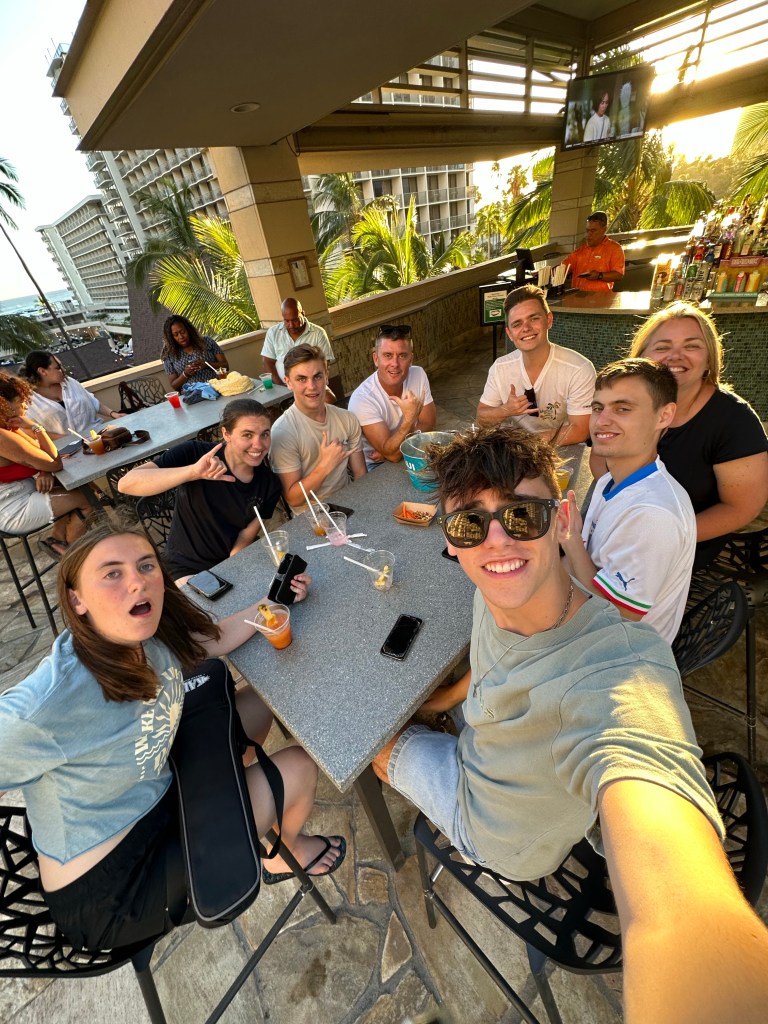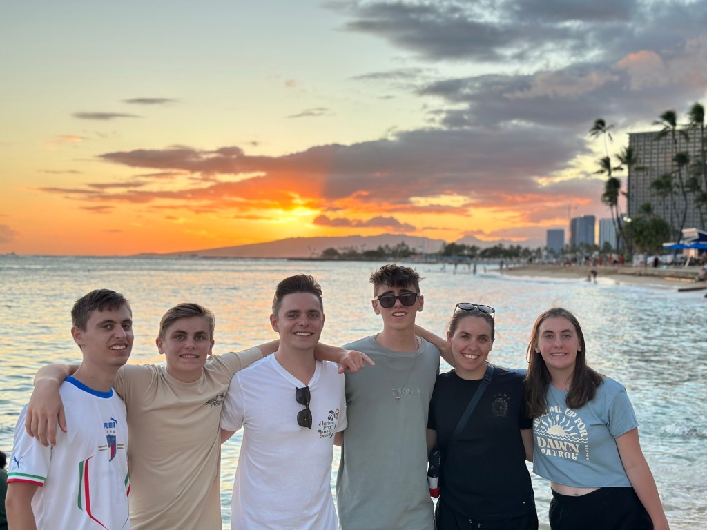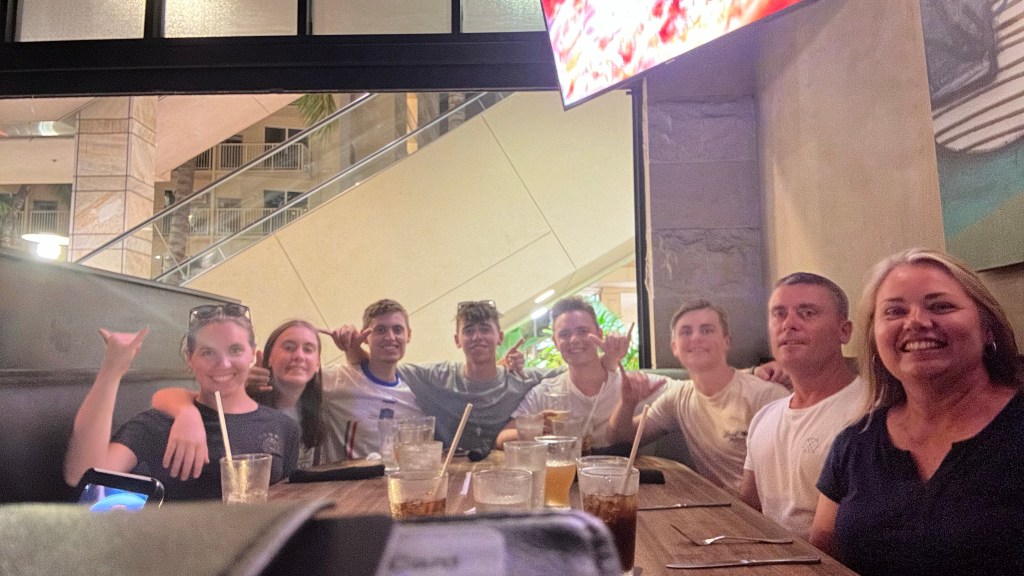 Instead, we marched down to Waikiki Beach for a final swim. After over an hour in the beautiful water there, Ross and most of the kids went exploring and hiking along the beachfront up towards the Diamond Head end of Waikiki , while Jarrod, Tim and I returned to the hotel. Tim had a uni meeting online to attend, and Jarrod needed to start packing – he leaves us in the early hours tomorrow morning as he has a 7am flight from Honolulu to Seattle and then on to Dublin and then to Manchester to meet a friend working over there.