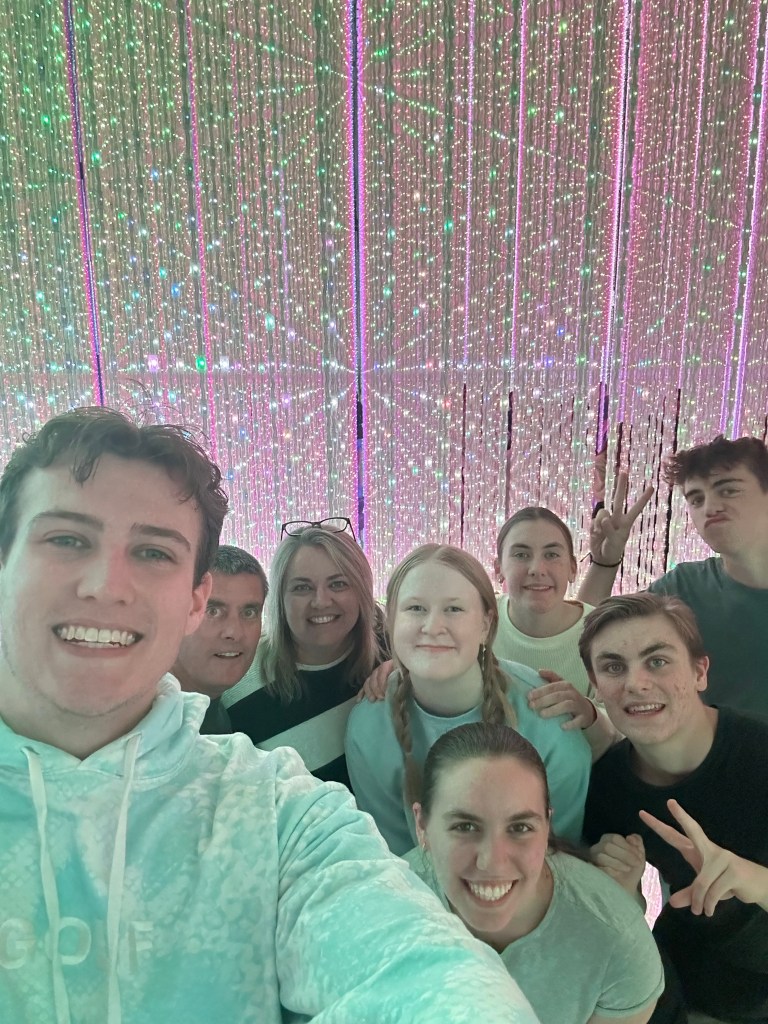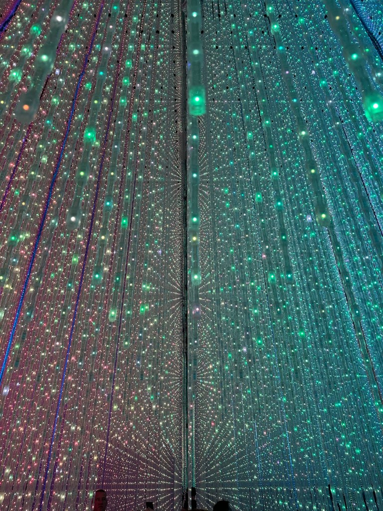 After two hours exploring the waterfront shopping area (including discovering a random Statue of Liberty replica), we chose our own lunch adventure from the food court (some Japanese traditional meals, some burger and fries from Wendy’s), and caught two more taxis to TeamLab Planets, 10 minutes away. This is an immersive art installation museum which is very instagrammable.