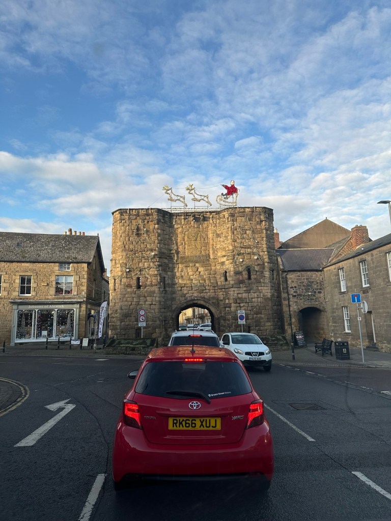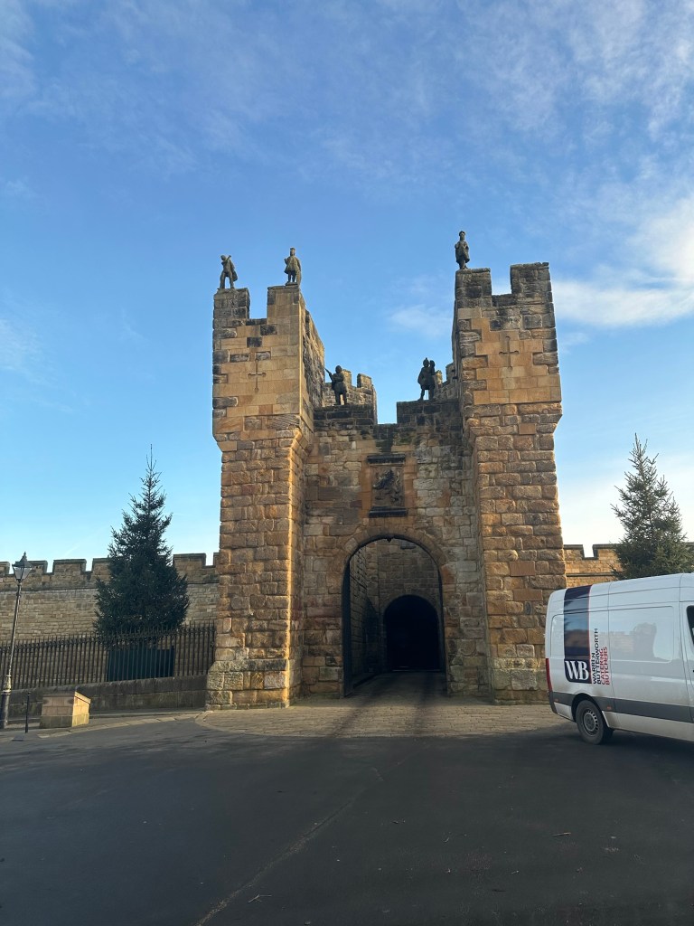 There was an historic single lane arch to get into Alnwick village, where some carollers from the local church were singing and Christmas markets were trading. We walked over to Greggs for lunch of sausage rolls and pasties, coffee and “yum yums” (cylindrical-shaped Krispy Kreme tasting donuts). From there we looked at Alnwick Castle – closed until Spring unfortunately, but it is where scenes from the first two Harry Potter movies were filmed.